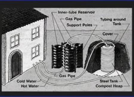 Back in the 1980's a Frenchman and his Wife Jean and Ida Pain developed what today is called the "Jean Pain Method" of composting and energy production. By chipping his lower limbs in his just over 15 hectares he captured over 40 tons of mulch and chipped it twice for a very fine compost. He then layered that into a circular heap by compacting it and wetting it as it built up. At the center point he placed a Stainless-steel barrel with half water and half pre-aged compost and fermented it to make methane gas. With this gas he could cook and run internal combustion engines, though his methods of gas collection left much to be desired to be safe. The rest of the heap of compost had up to 600 feet of black plastic tubing circled into it and covered tamped and wetted all of which was circling around the center barrel out to about 2 feet from the outer edge of the heap. This created the perfect condition to heat water to about 140 degrees F. This was domestic hot water, and it rose by convection to his hot water heater, circulated back to the system to keep it hot when not being drained into the domestic supply uses.
